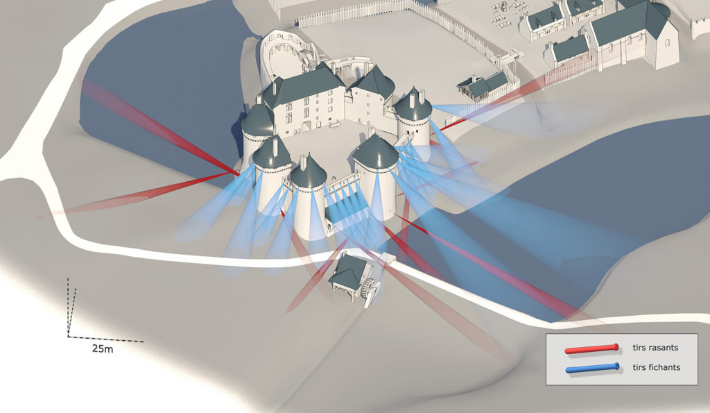 Restitution du plan de feu mis en oeuvre au château de Lassay dans les années 1450/1460. Les tirs rasants des veuglaires, en rouge, sont combinés aux tirs plongeants ou fichants des couleuvrines à main ou des haquebuttes, en bleu, positionnés à l’arrière des parapets des chemins de ronde. L’implantation des canonnières suit ainsi la pente de la vallée du Lassay jusqu’au moulin et la chaussée du Grand étang, au pied du château.