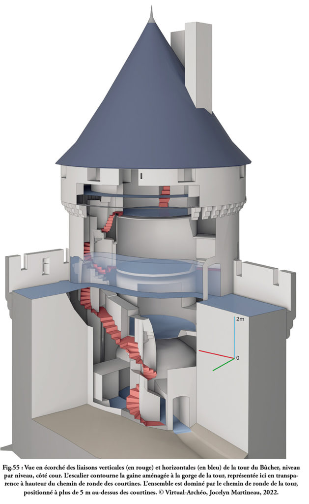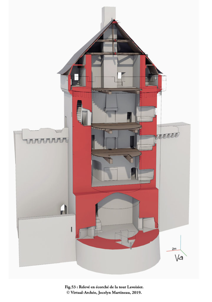 Fin des travaux entrepris avec Jocelyn Martineau et Marion Seure autour du château de Lassay et de son bourg. La tour Lavoisier et celle du Bûcher ont été modélisées sur la base du nuage de point issu du scan laser afin de pouvoir être découpées (écorchées) pour rendre compte au mieux des circuits de circulations verticaux et horizontaux.