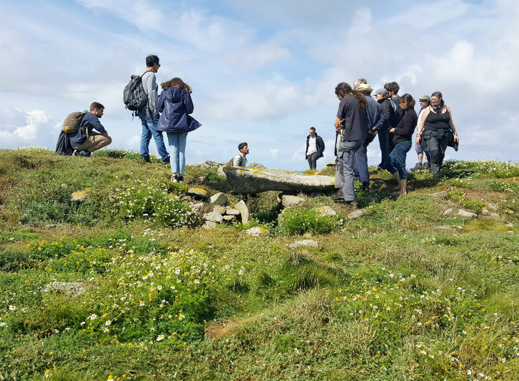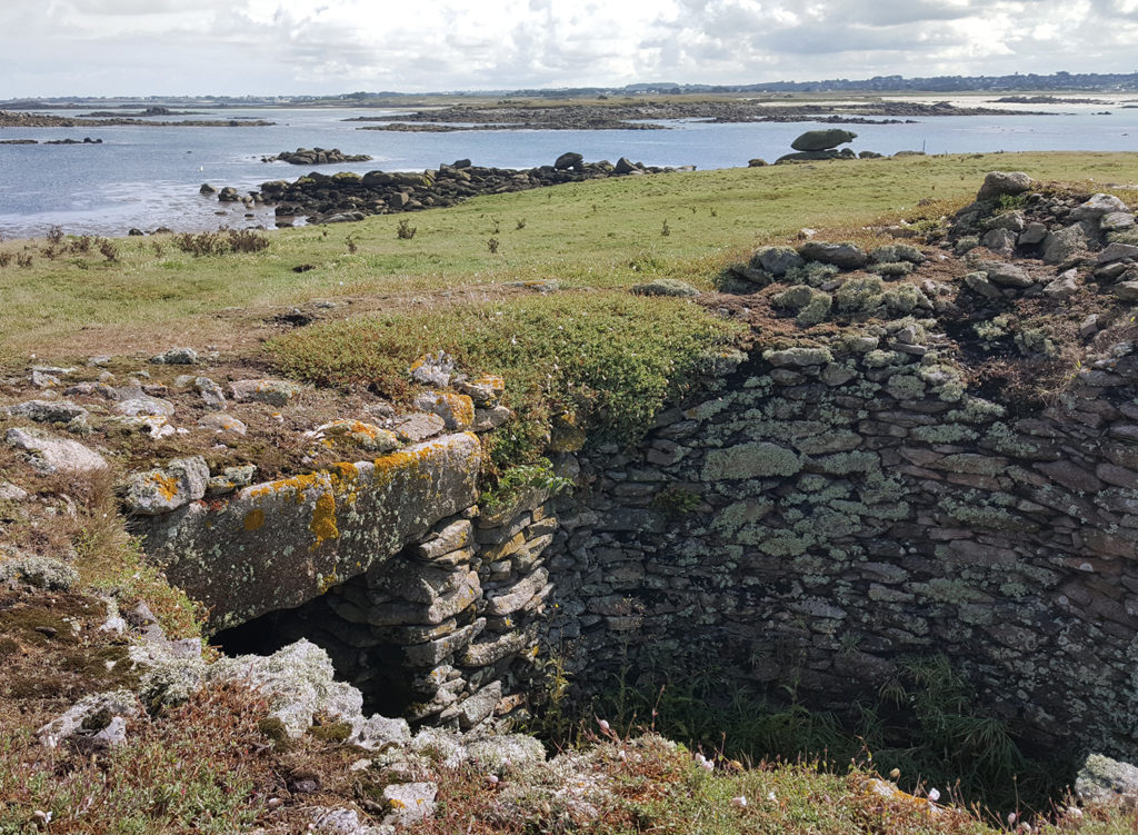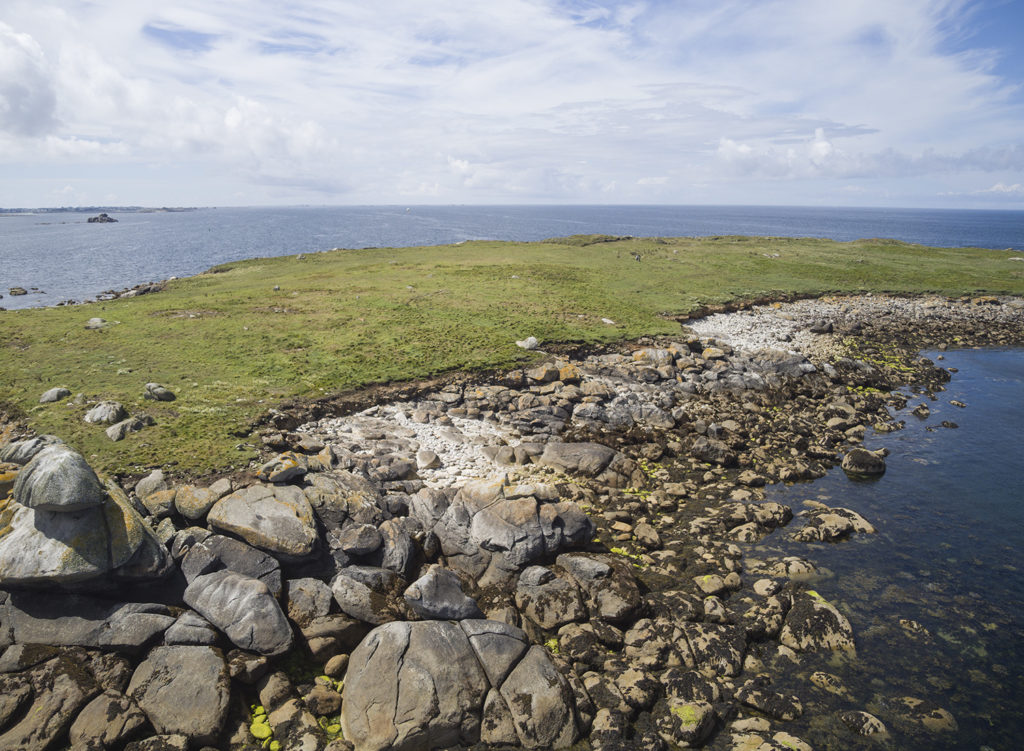 Île Guénioc (29) : visite du site et prises de vues aériennes en compagnie de Florian Cousseau qui dirigea la campagne de 2017, axée sur l’étude du bâti des cairns néolithiques. Un grand enclos et trois bâtiments gaulois bien visibles s’imbriquent au milieu des dolmens, entre les phares de l’île Vierge et d’Ouessant.